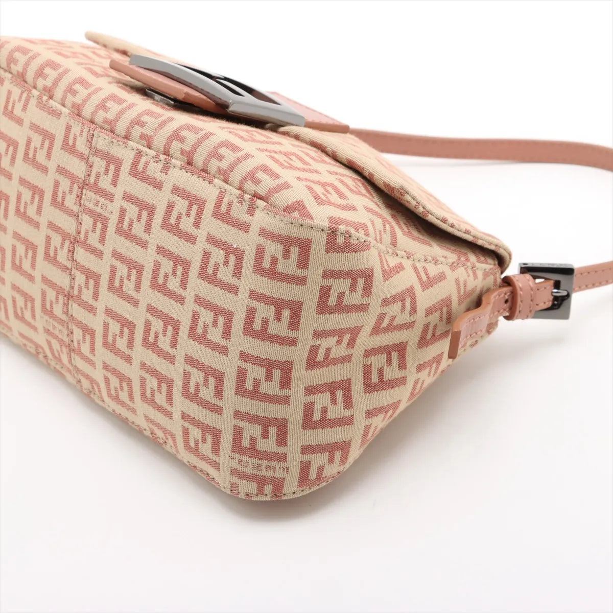 This is the iconic Fendi Baguette in a beige & pink signature monogram canvas. Features a pink leather trim with a matching leather front flap, and the classic oversized FF buckle in silver hardware. Compact yet holds a lot, this bag adds instant Y2K glam to any look.